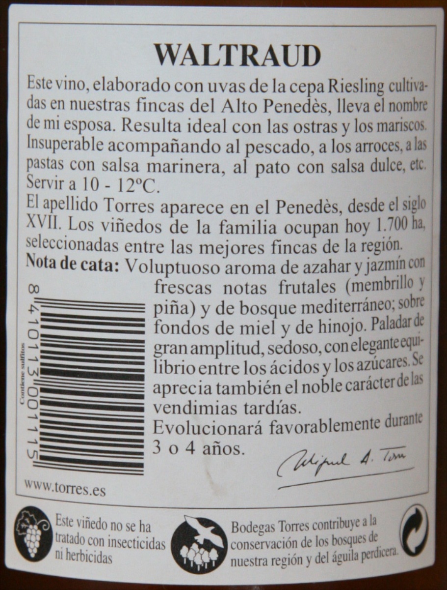 Der Knüller: ein spanischer Riesling, und dann noch mit dem Namen Waltraud! Und er schmeckt auch wie ein richtiger Riesling -- für einen spanischen gar nicht schlecht. Nicht wirklich bestechend, allerdings -- die meisten deutschen Rieslinge lassen ihn locker stehen. Erst recht die aus seiner Preisklasse, über 11 Euro, und das auf La Palma! Aber Waltraud hat sich sehr gefreut, als wir ihn ihr schenkten.