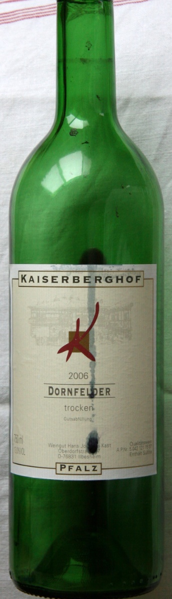 Eine Flasche zur Probe, geradezu auf Drängen von Herrn Kast, der sich beklagte, dass der Ruf des Dornfelders durch Billigangebote so gelitten hat. Nun, diesen fanden wir flach und wenig interessant, trotz sehr intensiver Farbe. Ein Vorurteil bestätigt. Schade.