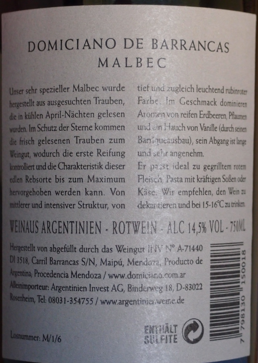 Dominiciano de Barrancas, Malbec, Cosecha Nocturna 2006