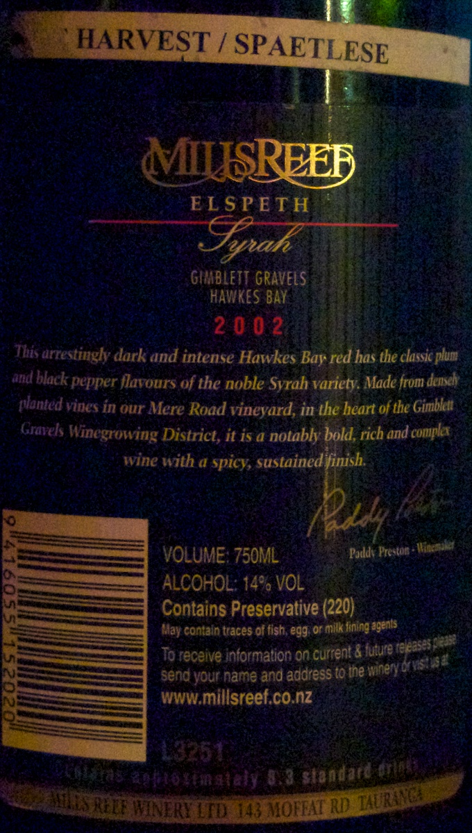Sehr kräftig, dunkel, breit, schwarze Beeren. Fand allgemein großen Anklang. Bring-a-Bottle, von John.