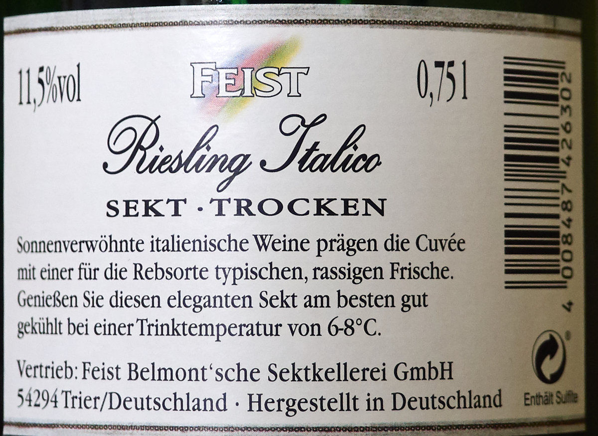 Ein deutscher Sekt aus italienischem Wein, und dann noch Riesling? Klingt abenteuerlich. Aber schmecken tut er durchaus. Mitgebracht von Hartmut und Gabi.