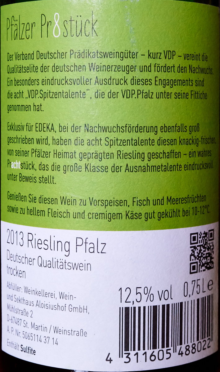 Wow, das ist mal ein junger Riesling! Frische, Mineralität, Frucht, alles voll da, und mit kraftvollem Auftritt. Dafür sagenhaft günstig bei Reichelt mit € 6,99.