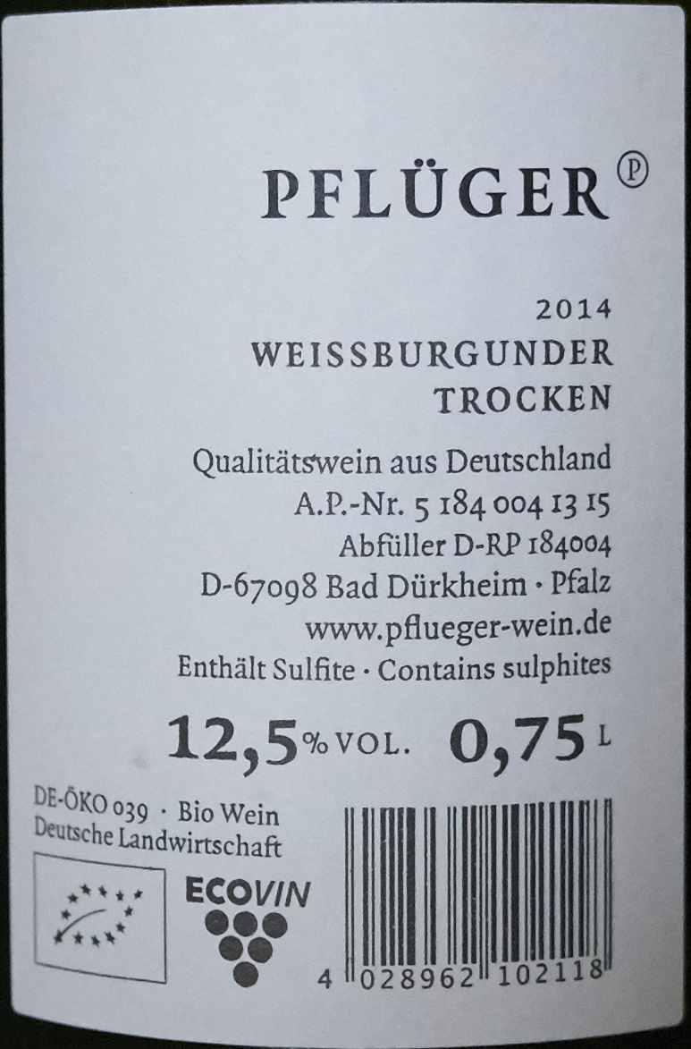 Das ist wohl die Sonderabfüllung für die Bio-Company. Für einen "einfachen" Weißburgunder geradezu perfekt sortentypisch, glitzert sogar ein bisschen, hat richtig Geschmack und eine ausgezeichnete Balance. Sehr attraktiv, und das bei 7 oder 8 €.