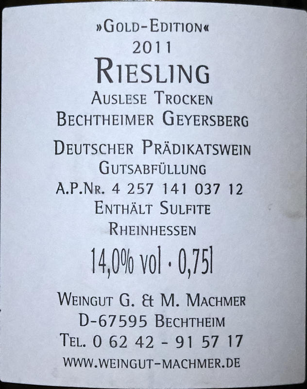 Fetter, gereifter Riesling mit schon leichtem Hauch von Petrolnoten. Sehr geil, zumal für den Preis: 11 € bei Machmer.
