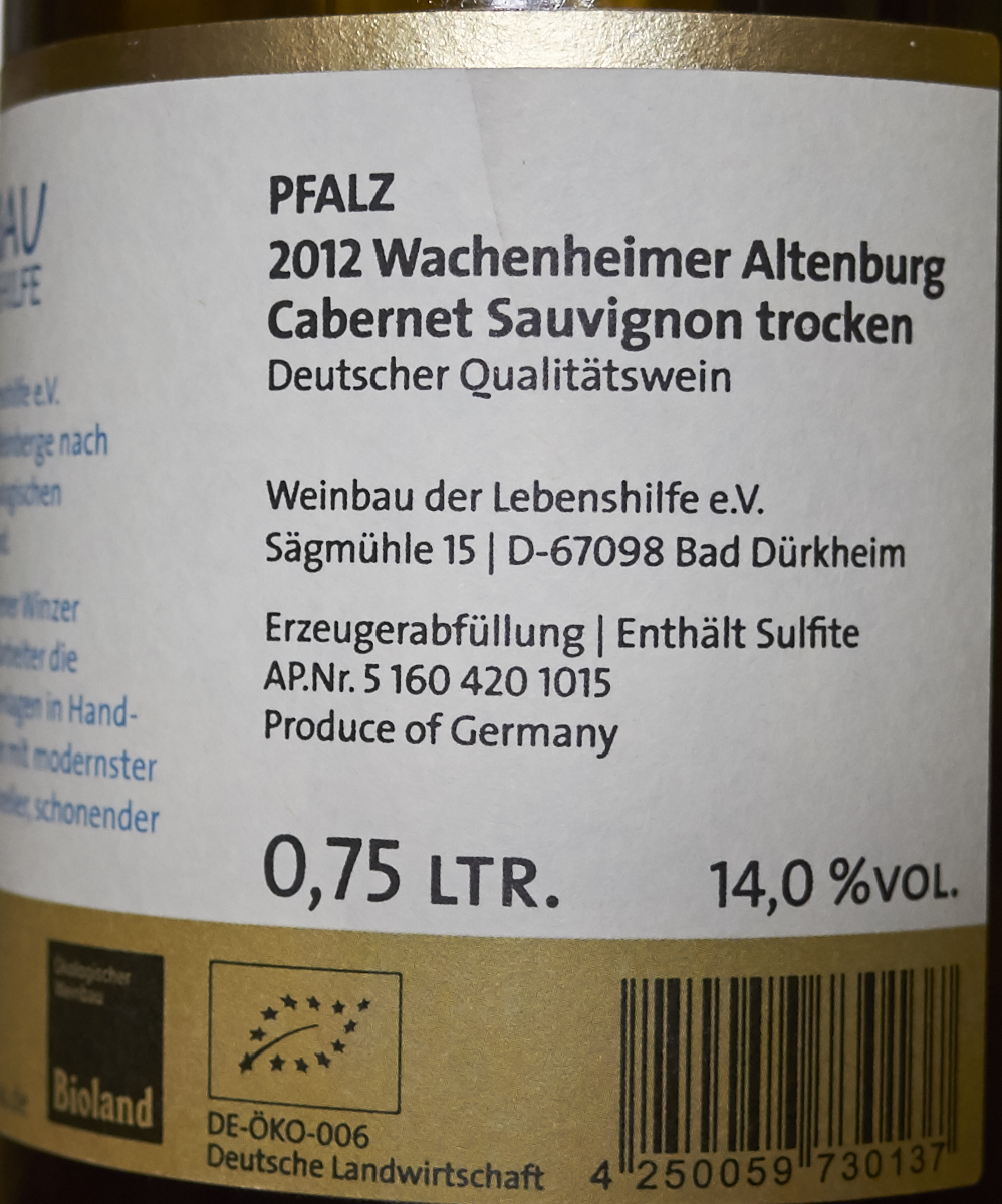 Weinbau der Lebenshilfe, Altenburg, Cabernet Sauvignon 2012
