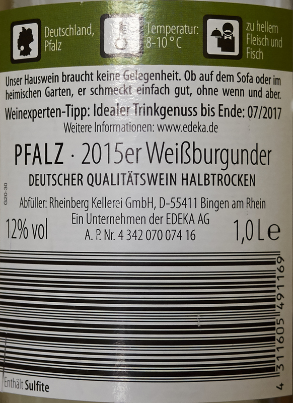 Sehr anständiger Weißburgunder mit Geschmack und allem. Das ist ein echter Knaller für € 2,99 bei Reichelt; Liter! Besser als der einfache Muth Riesling.