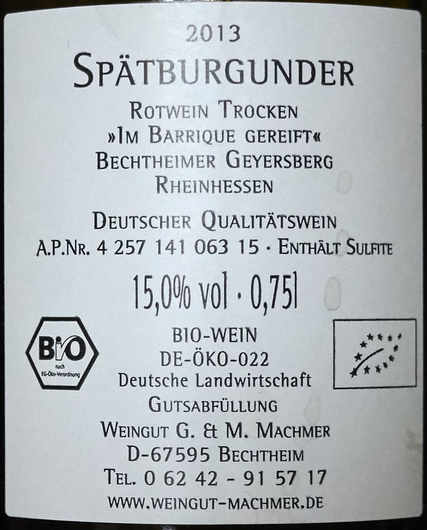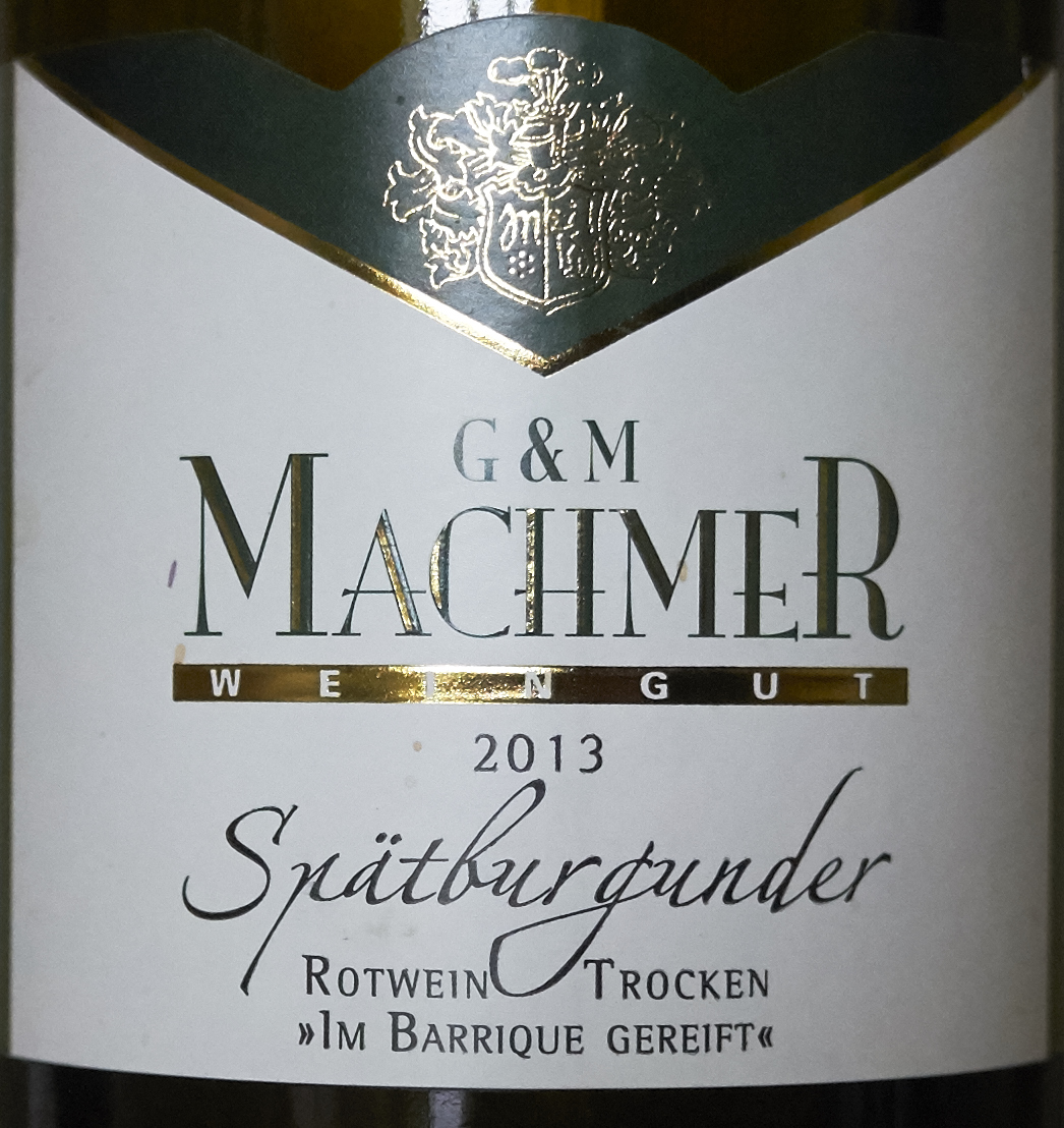 Sehr ordentlicher Spätburgunder; sollte er aber auch sein mit 15,90 €(?) bei Machmer. Der von der Lebenshilfe Dürkheim war deutlich besser.