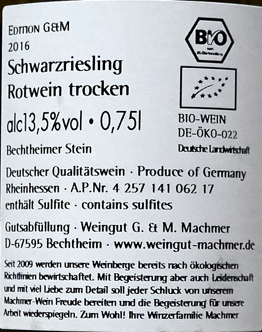 Der sei erhitzt vergoren und habe deswegen kein Tannin, das ja manche stört. Hier ist in der Tat nichts störendes dabei – an sich kein schlechter Wein, aber besonders auffällig ist eben genau dieses Fehlen jeder Ecken und Kanten. Für die inoffensive Position ist aber der halbtrockene Spätburgunder schon besser. Machmer, € 7,20.