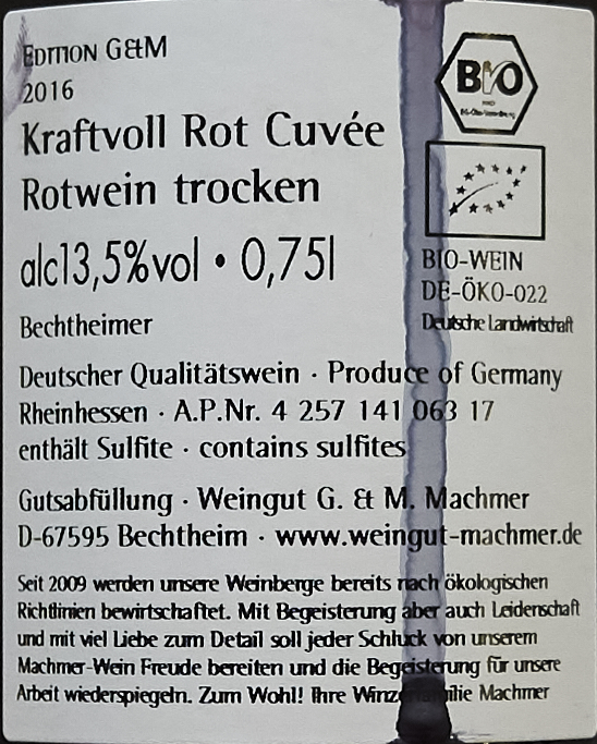 Rote Cuvée, ganz schön, aber aus meiner Sicht weniger als der trockene Spätburgunder und der Cabernet Sauvignon. Machmer, € 7,20.