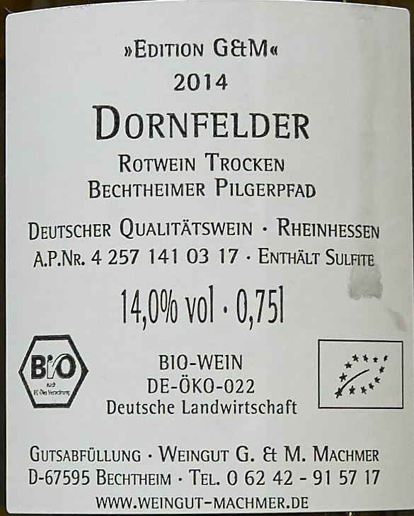Der Wunder-Dornfelder, jetzt endlich mal gekauft. Attraktiv und würzig gefällt er mir fast besser als der Cabernet Sauvignon. Oder nicht nur fast. Machmer, € 7,90 oder so.