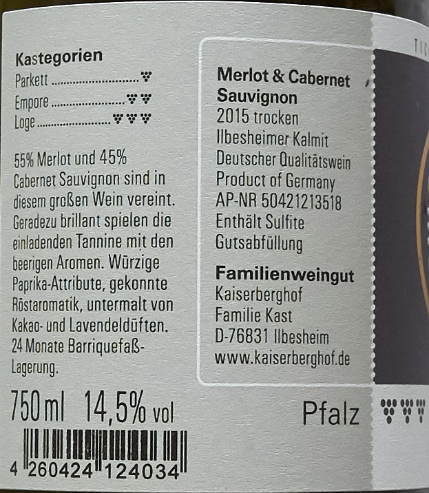 Na, wollen sie damit Bordeaux Konkurrenz machen? Klappt nicht. Ist aber ein schöner, intensiv knorriger Rotwein. Bei Kast, € 8,90.