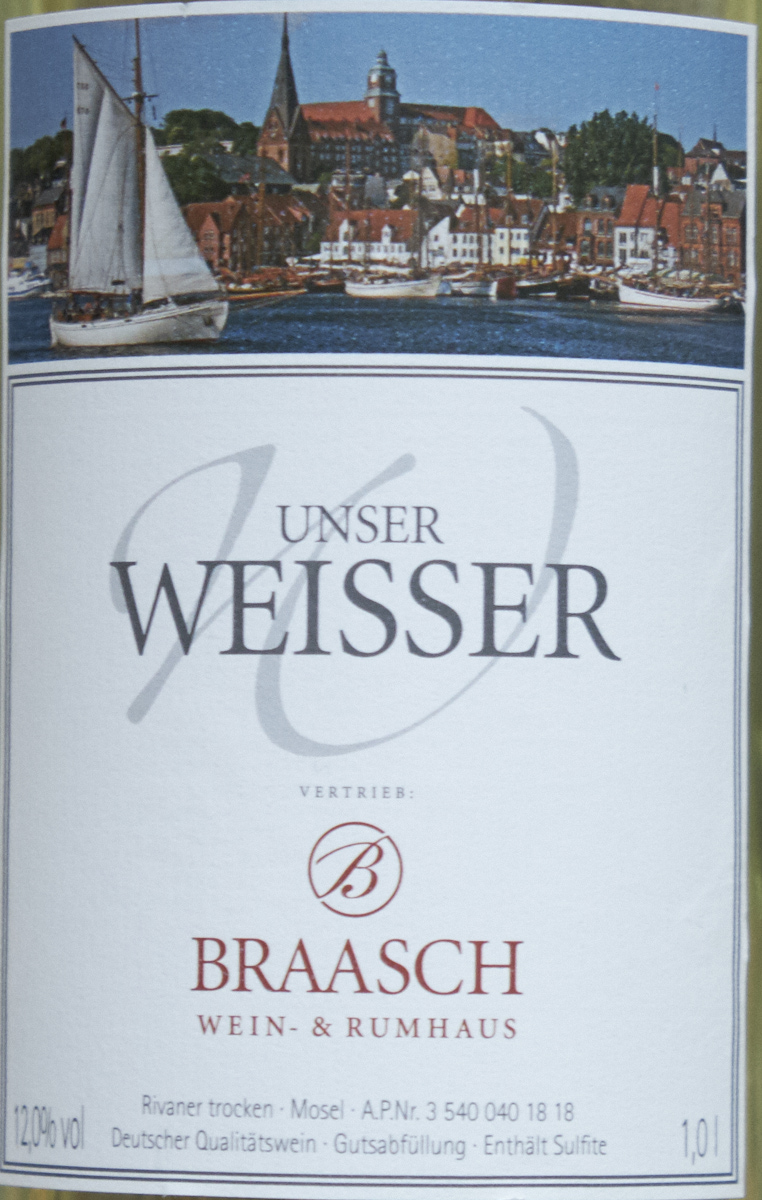 Braasch ist natürlich nur der Vertrieb, der Hersteller ist nicht angegeben, nur das Gebiet, Mosel. Ein relativ trockener Rivaner, aber ein klein bisschen Restsüße hat er noch. Sehr frisch, deutlich perlig, und auch wenn er ohne Jahresangabe kommt, bin ich mir doch sicher, das ist ein 2018er. Nicht übel, frisch, ganz attraktiv, mäßig ausdrucksstark, aber das ist völlig in Ordnung für so eine Literware. Als solche ist er dann allerdings nicht billig – aber man bedenke, das ist die Top-Touri-vorbeilauf-Adresse, und es ist in Flensburg, da ist die Konkurrenz nicht riesig. Der Kollege Tiller ist nicht weit, aber eben gerade 30 m außerhalb der Touristenströme. Bei uns wäre so eine Qualität vermutlich eher näher an 4 Euro für 0,75 l als über 5. Flensburg, Braasch, 6,95 €/l.