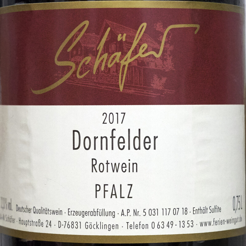 In der Liste als trocken angegeben, aber das war er höchstens hart an der Grenze zu halbtrocken. Ziemlich Dornfelder-typisch, nicht so spannend. Schäfer, € 3,80.