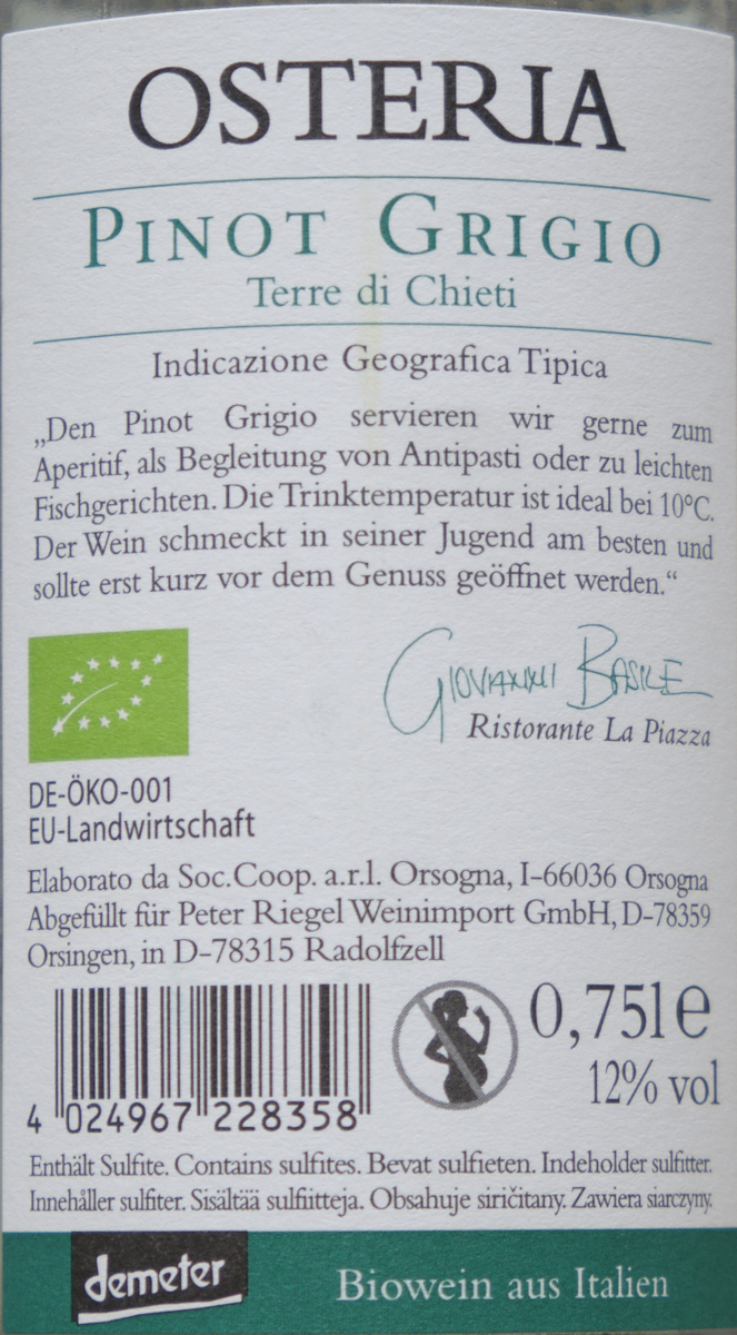 Jung, frisch, sortentypisch; gut für einen einfachen Pinot Grigio. Mitgebracht.