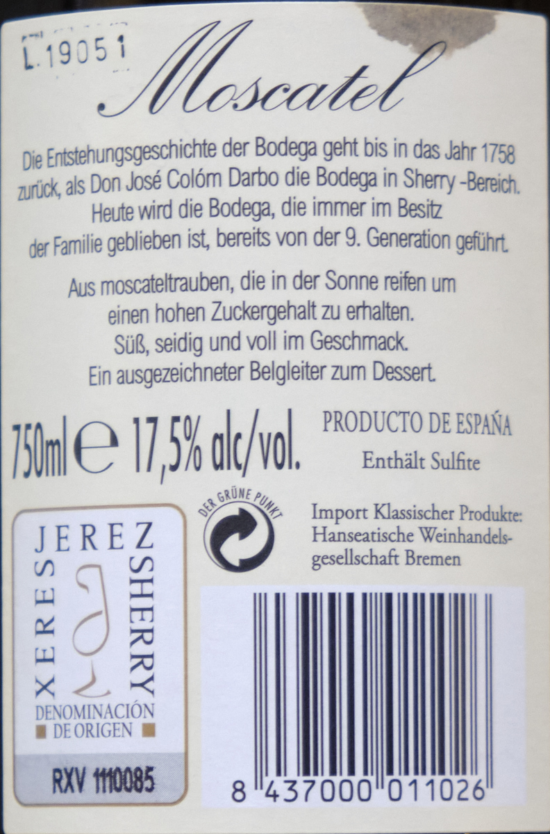Endlich mal ein richtiger Moscatel! Für einen einfachen ist der schon wirklich ganz schön, angenehmer als das PX-Schweröl Nectar. Täglich muss ich den aber auch nicht haben. Spanische Bodega, 16,38 €.