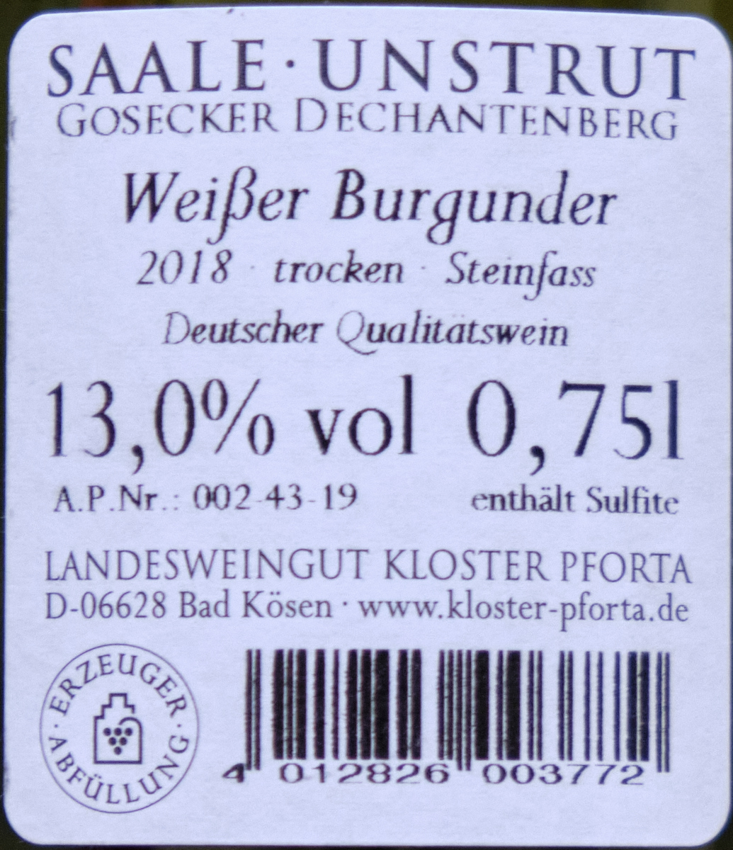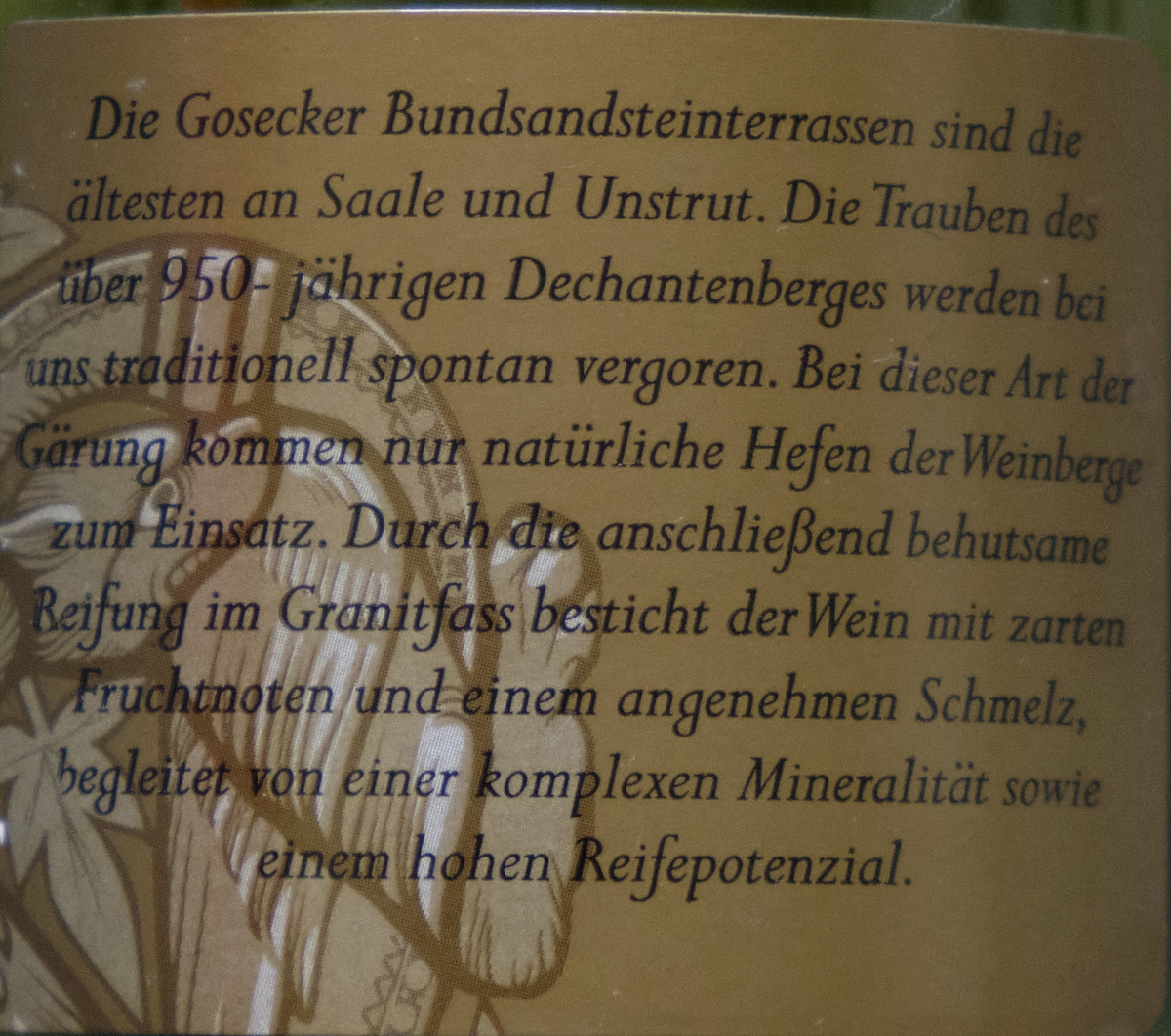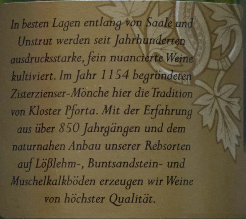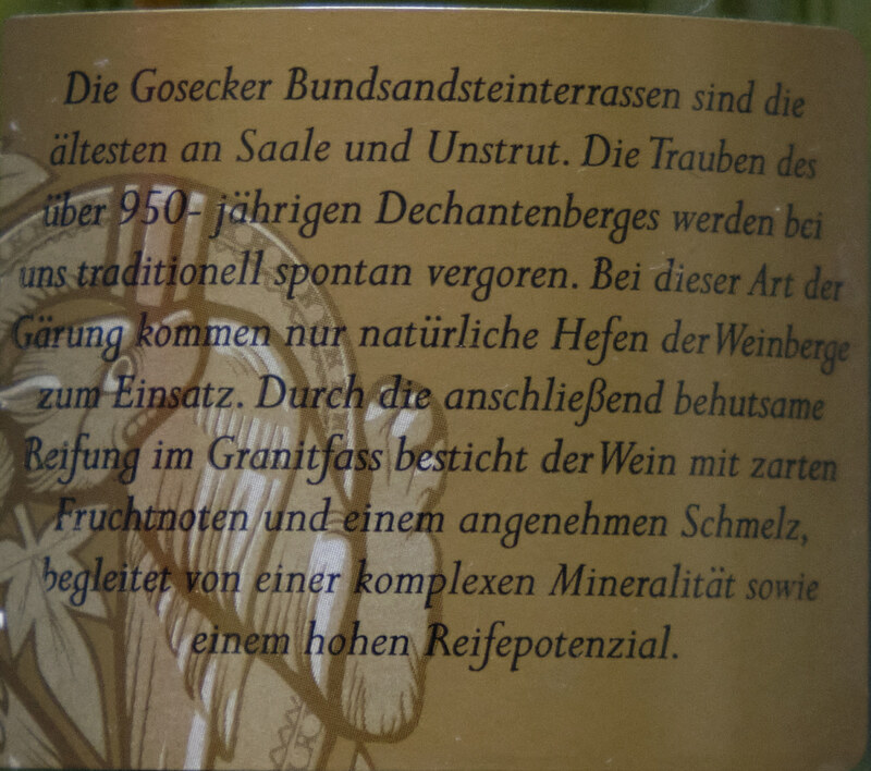 Aus dem Granitfass. Erst fand ich ihn relativ belanglos, aber dann gefiel er mir immer mehr. Schöne subtile Würze und Mineralität, vergleichsweise zurückhaltende, aber attraktive Frucht. Der wurde immer besser! Trotzdem dafür eigentlich zu teuer, gerade im internationalen Vergleich. Mitgebracht aus Naumburg, bei 24 €.