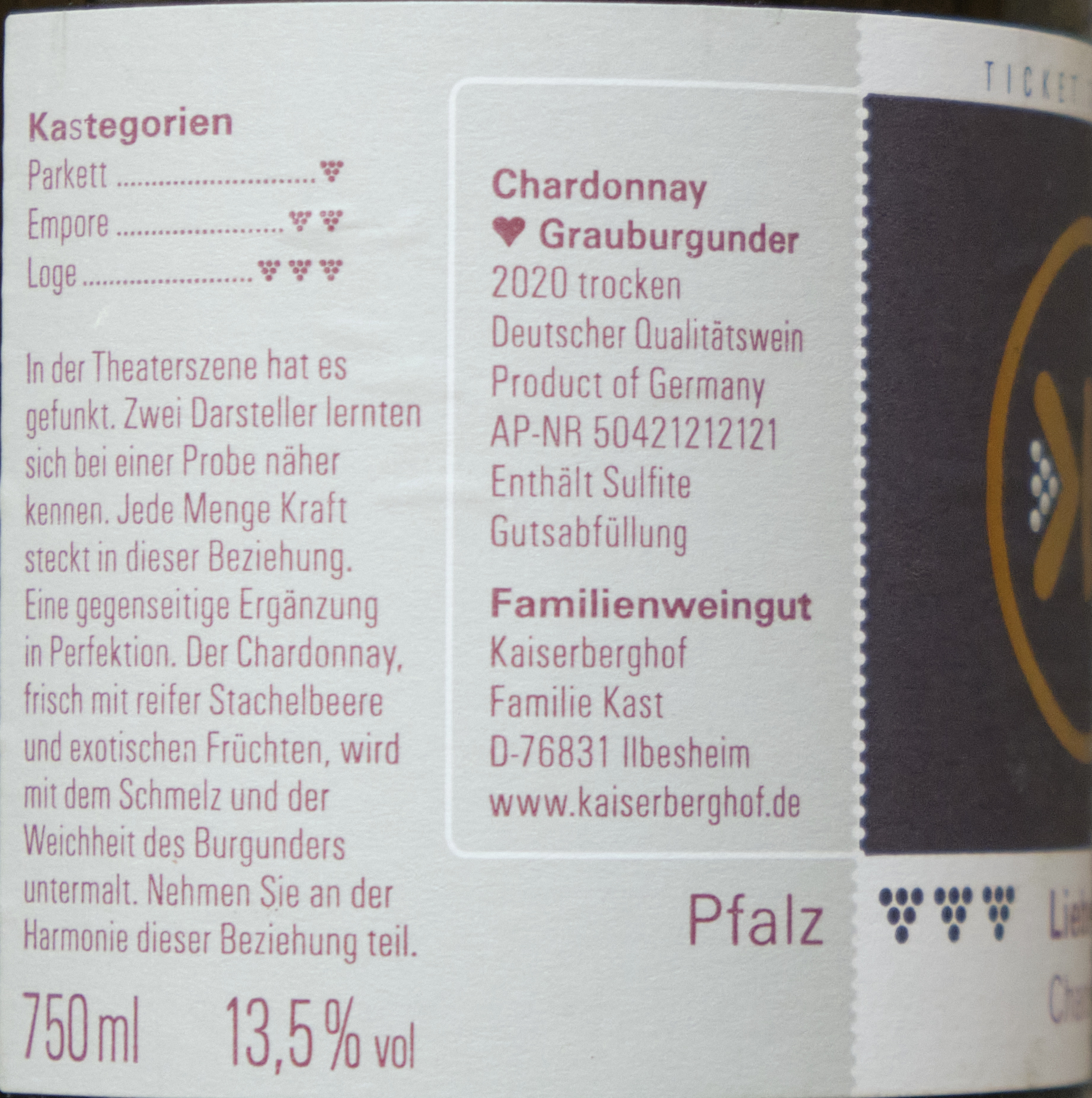 Eine Chardonnay-Grauburgunder-Cuvée, etwas Restsüße, leichtes Prickeln, und wirklich attraktive Aromen mit einer schönen Balance aus Mineralität und Frucht. Der ist im allerbesten Sinn außerordentlich gefällig und sehr harmonisch. Den Spitzenplatz unter meinen Lieblingsweinen kriegt er nicht, aber er ist schon sehr gelungen und gefällt mir richtig gut. Geschenkt.
