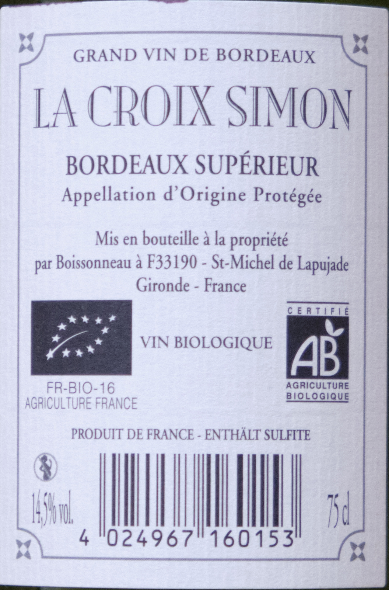 Wie zu erwarten bei der regionalen Appellation Bordeaux Supérieur nichts großartiges. Er hat Farbe und etwas Geschmack, ist aber eigentlich recht langweilig. Trinkbar, aber keine nennenswerten Fehler oder Vorzüge. LPG 6,99 €