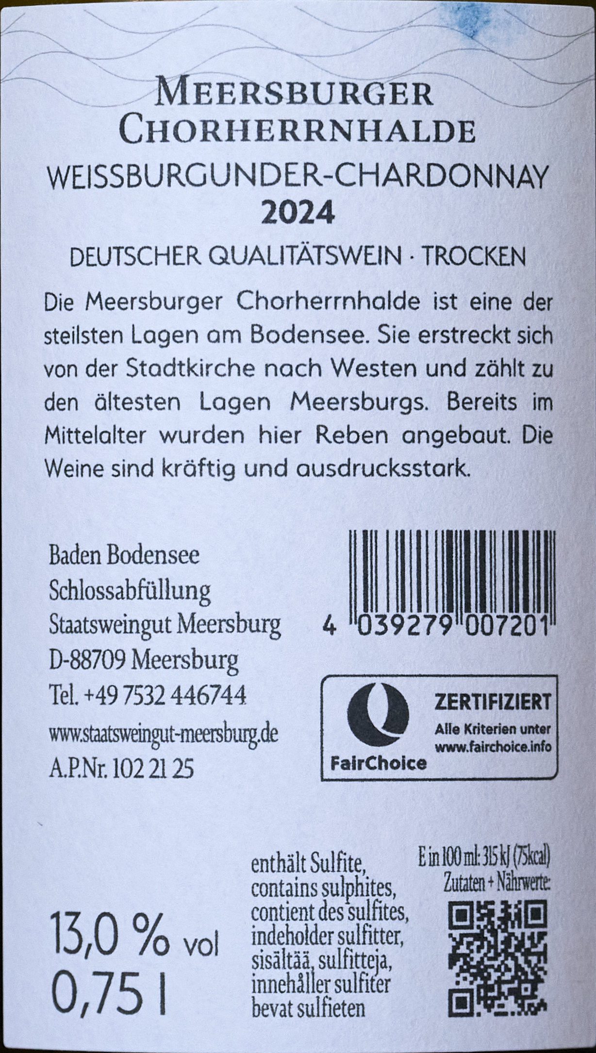 Staatsweingut Meersburg, Meersburger Chorherrenhalde Weißburgunder Chardonnay trocken 2024