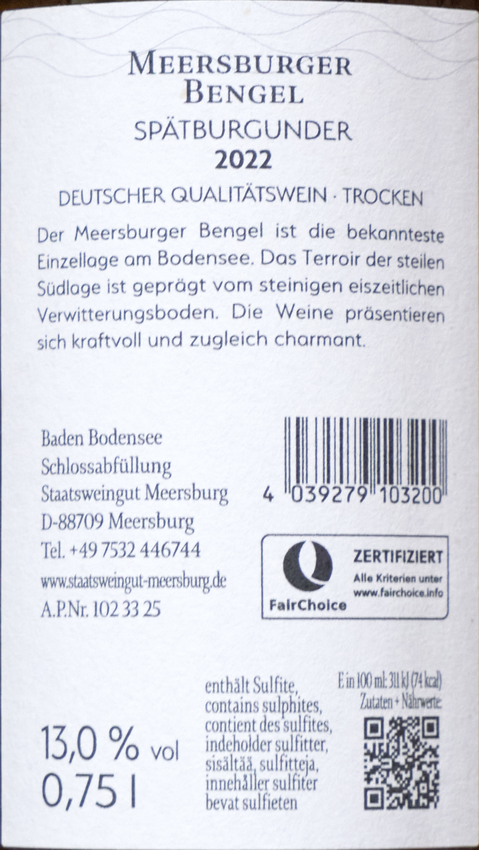Staatsweingut Meersburg, Meersburger Bengel Spätburgunder trocken 2022